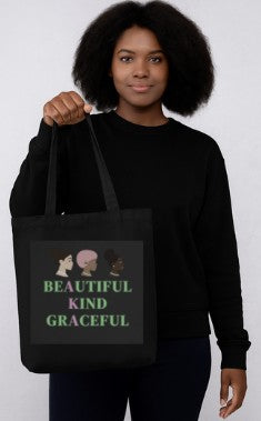 Make a bold statement while being kind to the planet. This spacious tote features the empowering “Beautiful. Kind. Graceful.” design with three striking profile illustrations that celebrate strength, unity, and identity. Whether you're hitting the farmer’s market, library, or a day out, this bag blends everyday function with artistic flair.