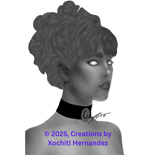 In a world suspended between memory and mist, "The Silent Muse" gazes beyond the veil, her expression serene yet unknowable. The artist turned this digital art into a stunning canvas for any room. Rendered in grayscale, her alabaster eyes hold no reflection—only the weight of forgotten dreams and unspoken thoughts. Her intricately coiled hair and the Victorian choker adorning her neck speak of another era, where beauty and sorrow walked hand in hand. She is timeless, a spectral inspiration whose silence echoes louder than words. She does not speak—she listens, remembers, and endures.