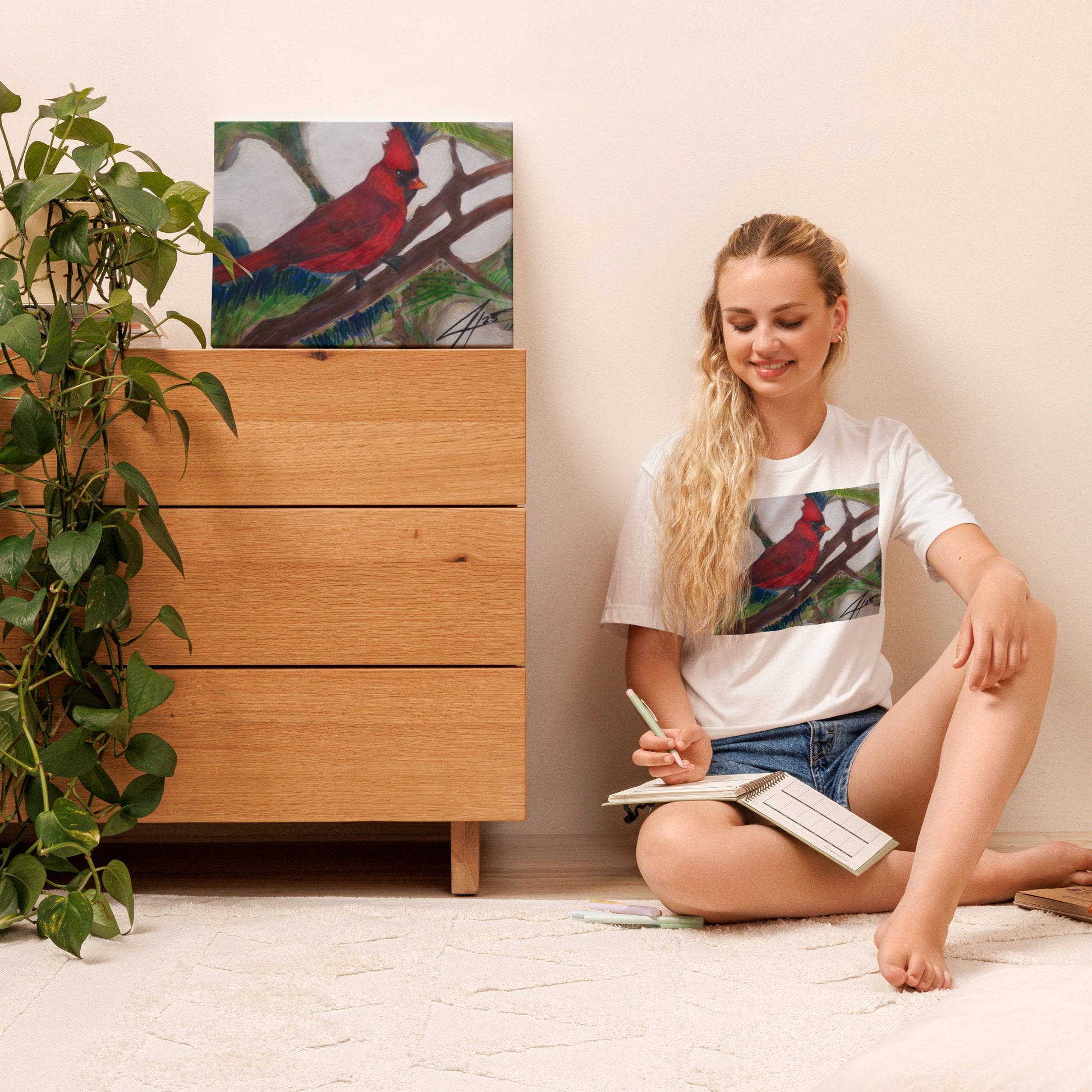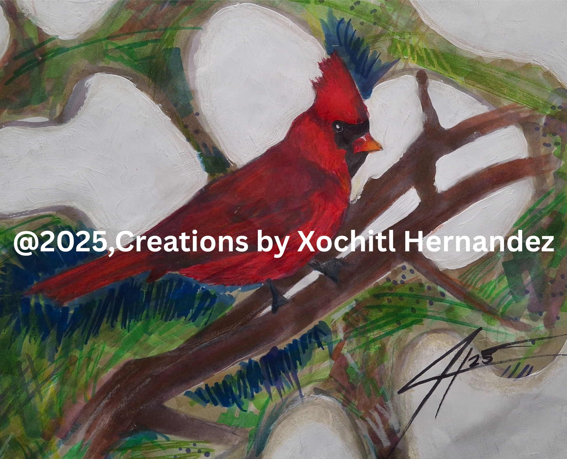 "Where Hope Rest" captures a vibrant red cardinal perched with quiet strength among bare winter branches. The bird’s bold plumage contrasts with a snowy backdrop and abstracted woodland textures, symbolizing resilience and color in the quiet of winter. The expressive brushstrokes and vivid palette reflect Isabella Xochitl Hernandez’s signature style—where natural elegance meets emotional depth. A stunning tribute to nature’s beauty and solitude, this piece brings warmth and serenity to any space.