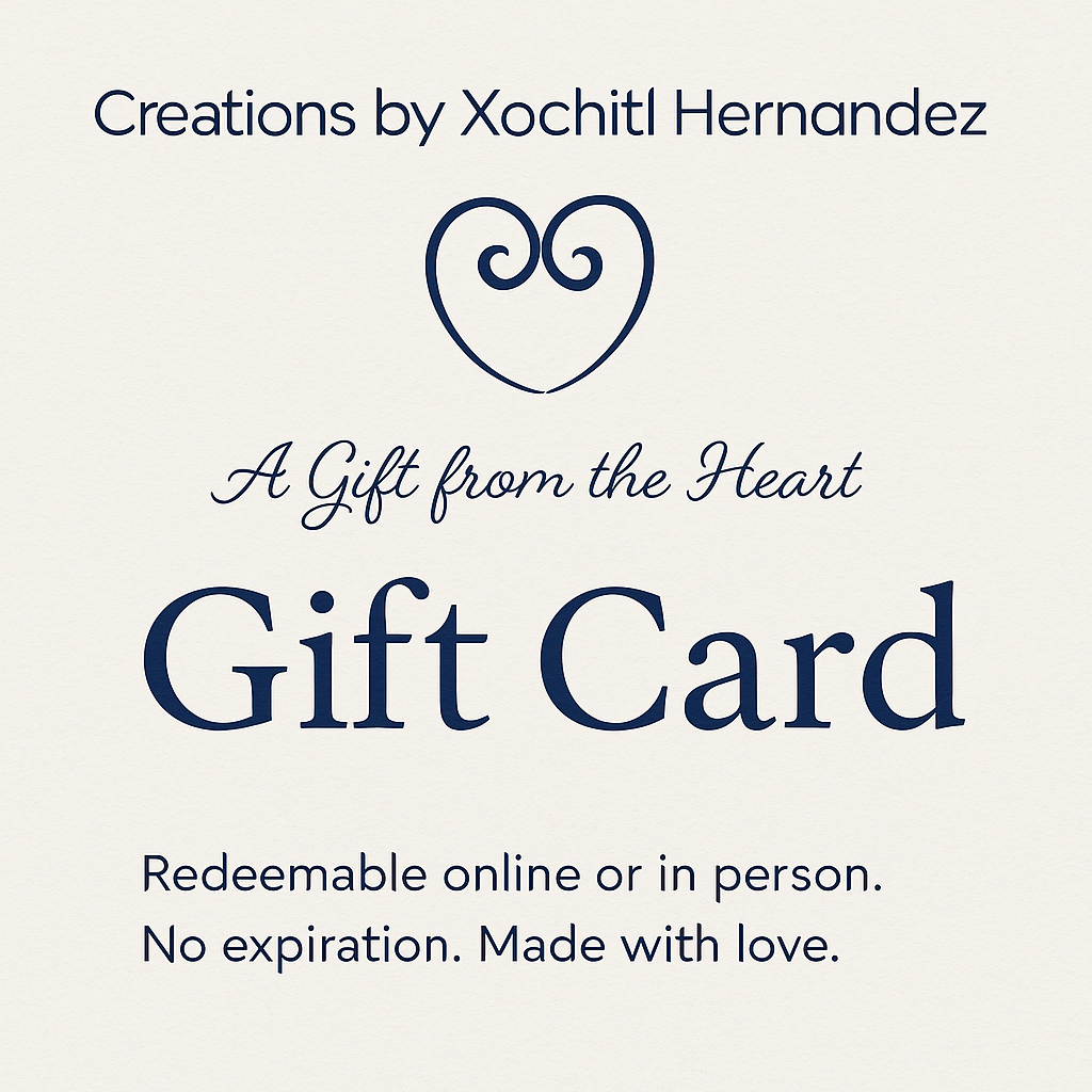 Give the perfect gift—every time. A "Creations by Xochitl Hernandez" Gift Card offers ultimate flexibility and thoughtful convenience, letting your loved ones choose exactly what they want. Whether it’s for a birthday, holiday, thank-you, or just because, our gift cards are redeemable online or in-store and never expire. Available as a physical card or a digital e-gift, it’s the ideal last-minute present that feels anything but.