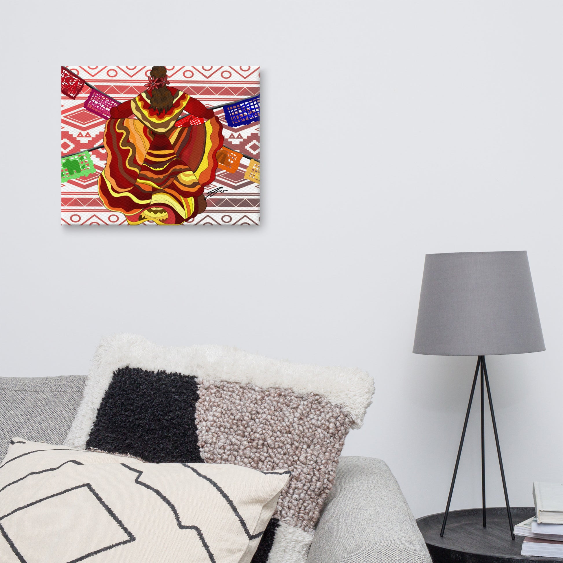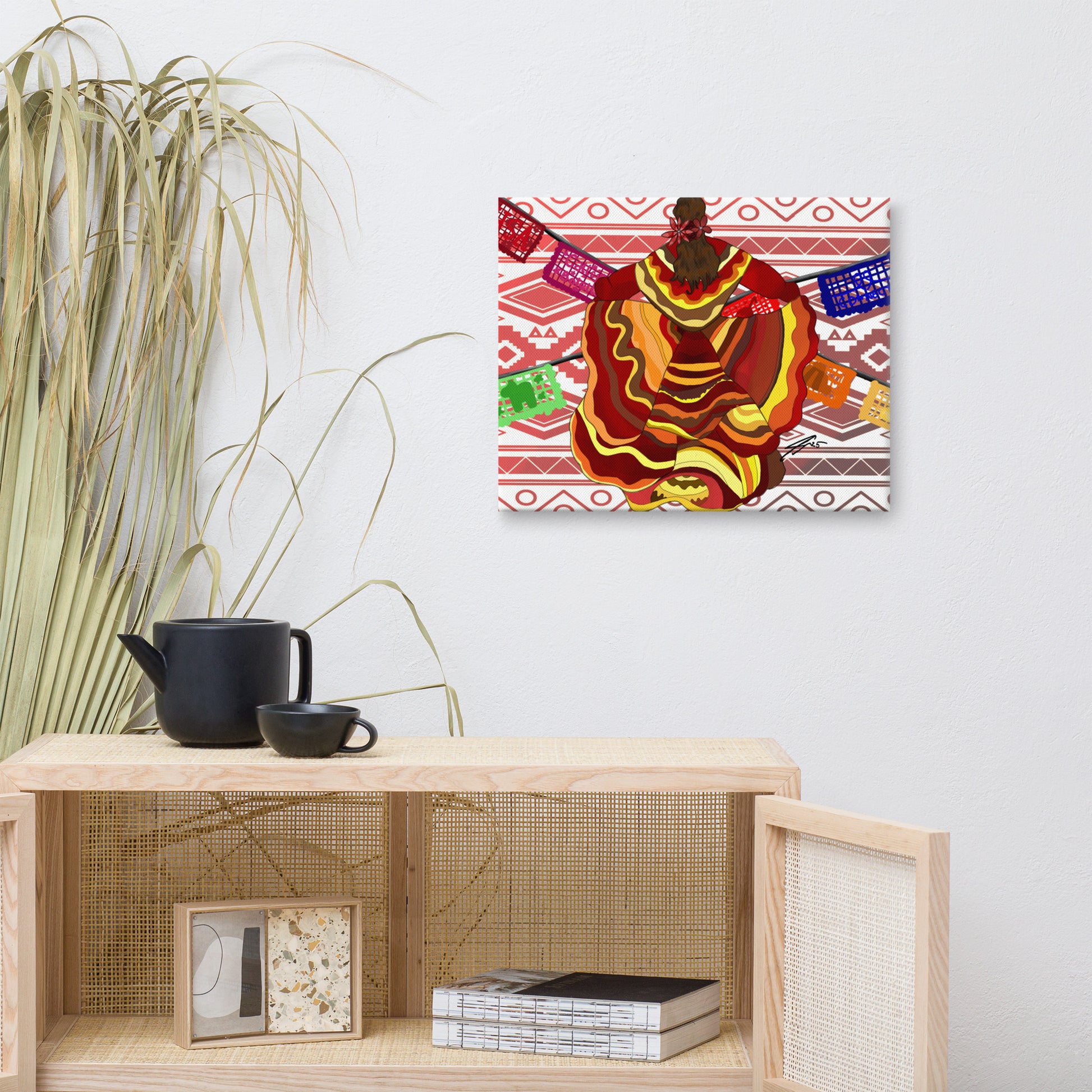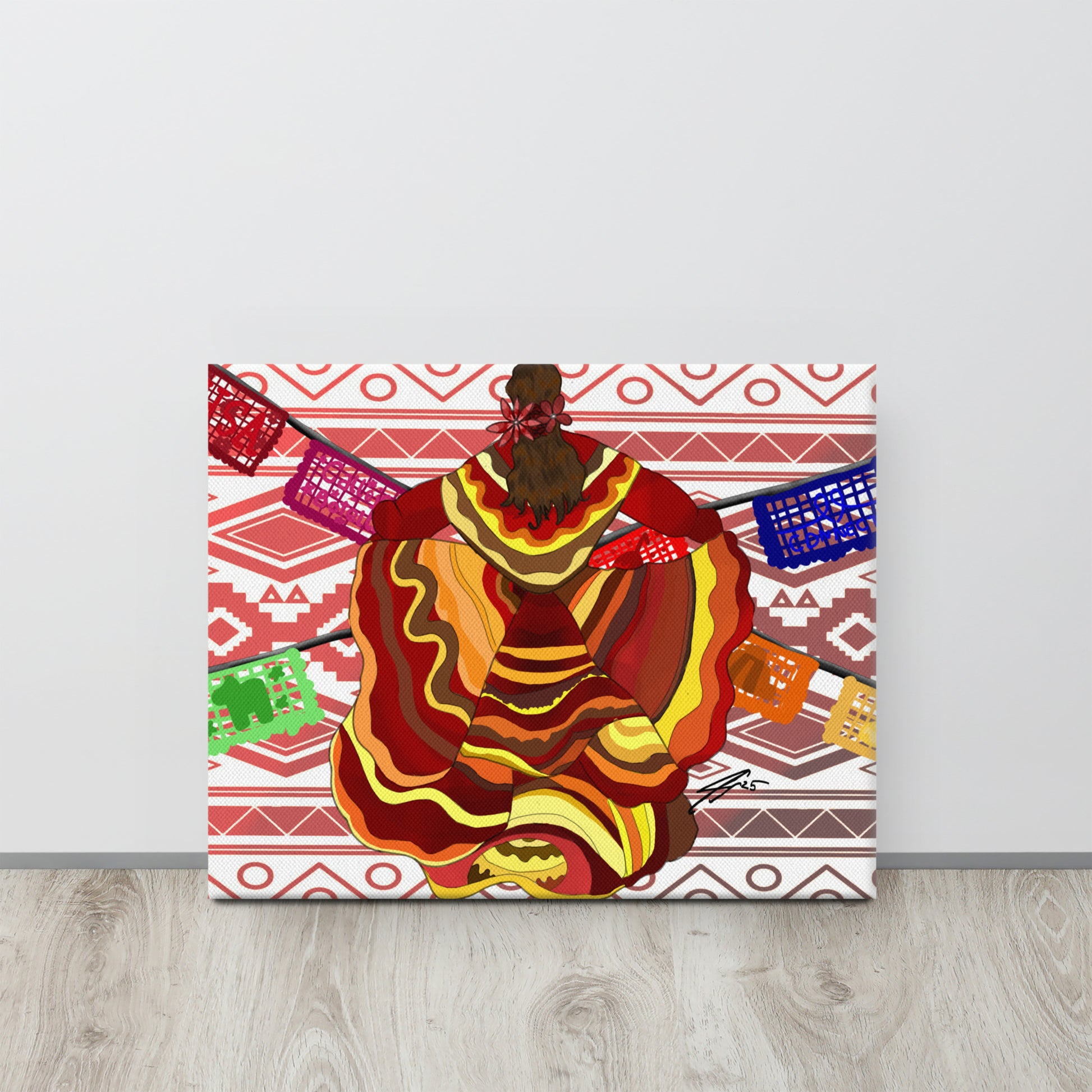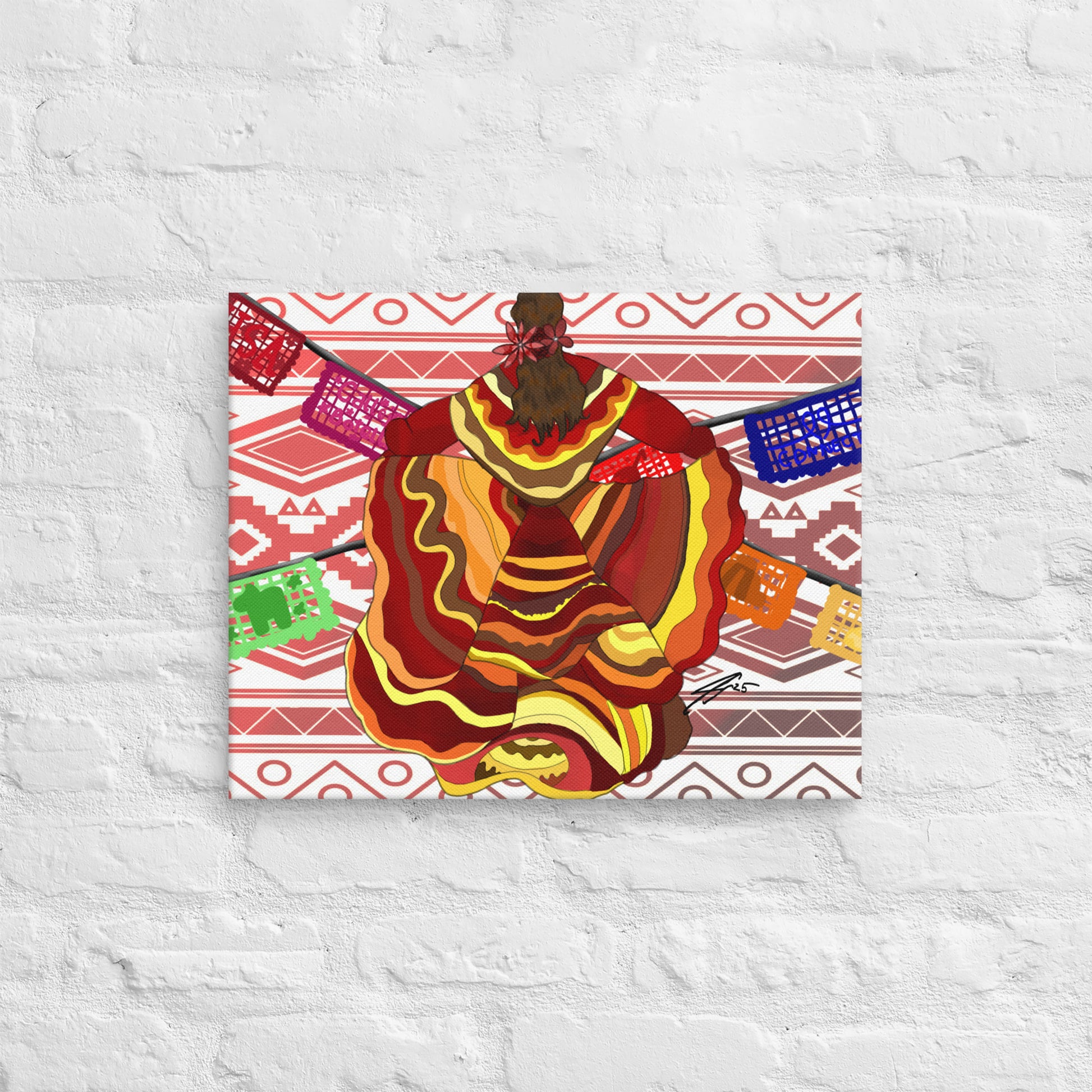 Celebrate culture, passion, and movement with "Do What You Love, Love What You Do" a vibrant work by artist Isabella Xochitl Hernandez. This stunning piece captures the energy of folklórico dance, honoring Mexican tradition with a modern flair. From the swirling, fiery hues of the dancer’s dress to the papel picado flags extending outward, every detail is a joyful nod to identity, heritage, and creative expression.