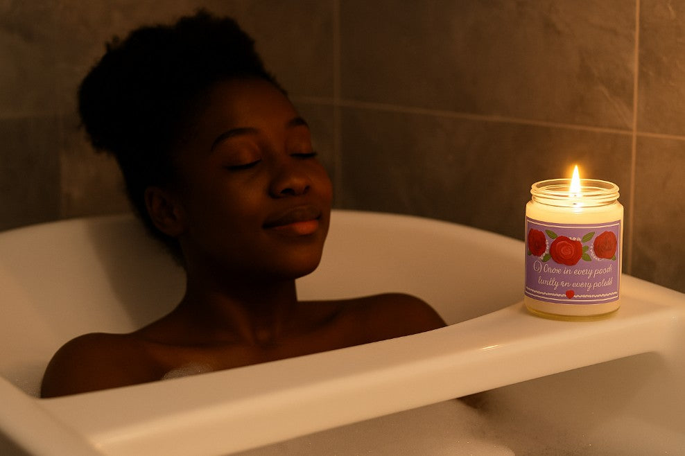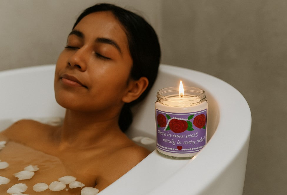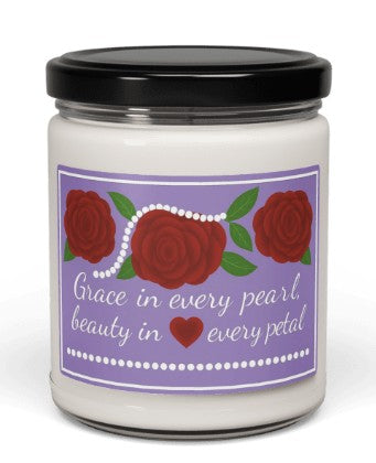 Soft, clean, and calming—this candle brings peace to your space with the earthy aroma of white sage and soothing lavender. Adorned with original artwork by local artist Isabella Xochitl Hernandez, the design features vibrant roses and pearls alongside the heartfelt phrase “Grace in every pearl, Beauty in every petal.” Housed in a sleek glass jar, it’s perfect for gifting, relaxing, or adding a touch of elegance to any space.