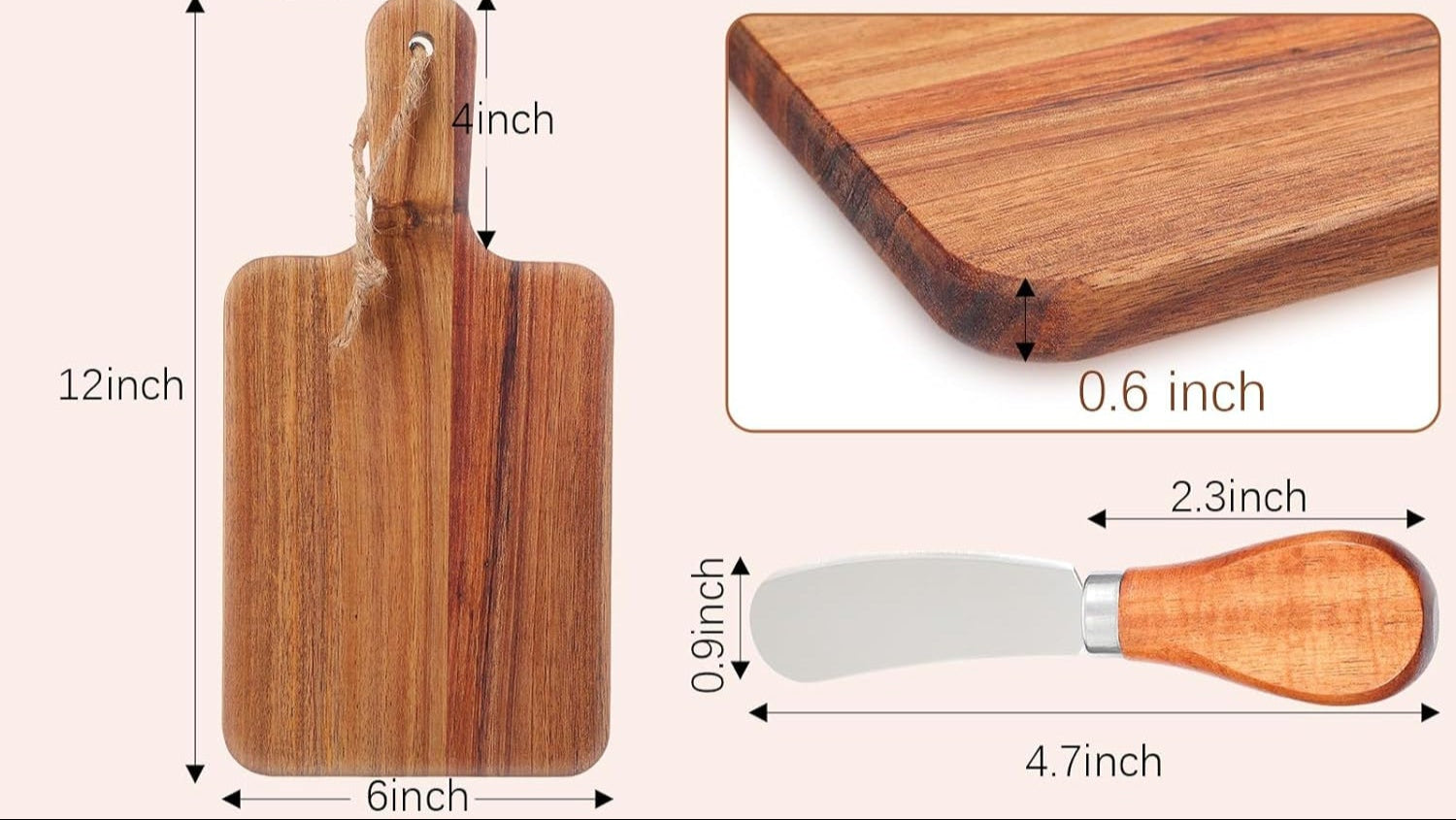 - Board Size: 12" x 6" (with a 4" handle), 0.6" thick for a sturdy feel