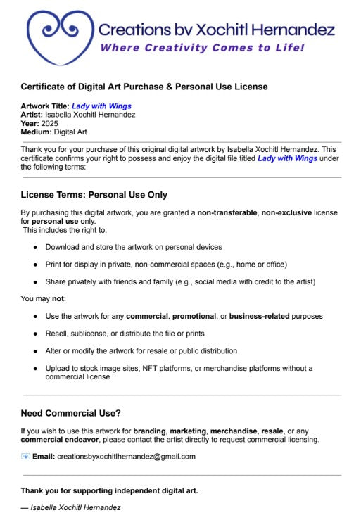"Lady with Wings" (Digital Art with Personal Use Certificate)