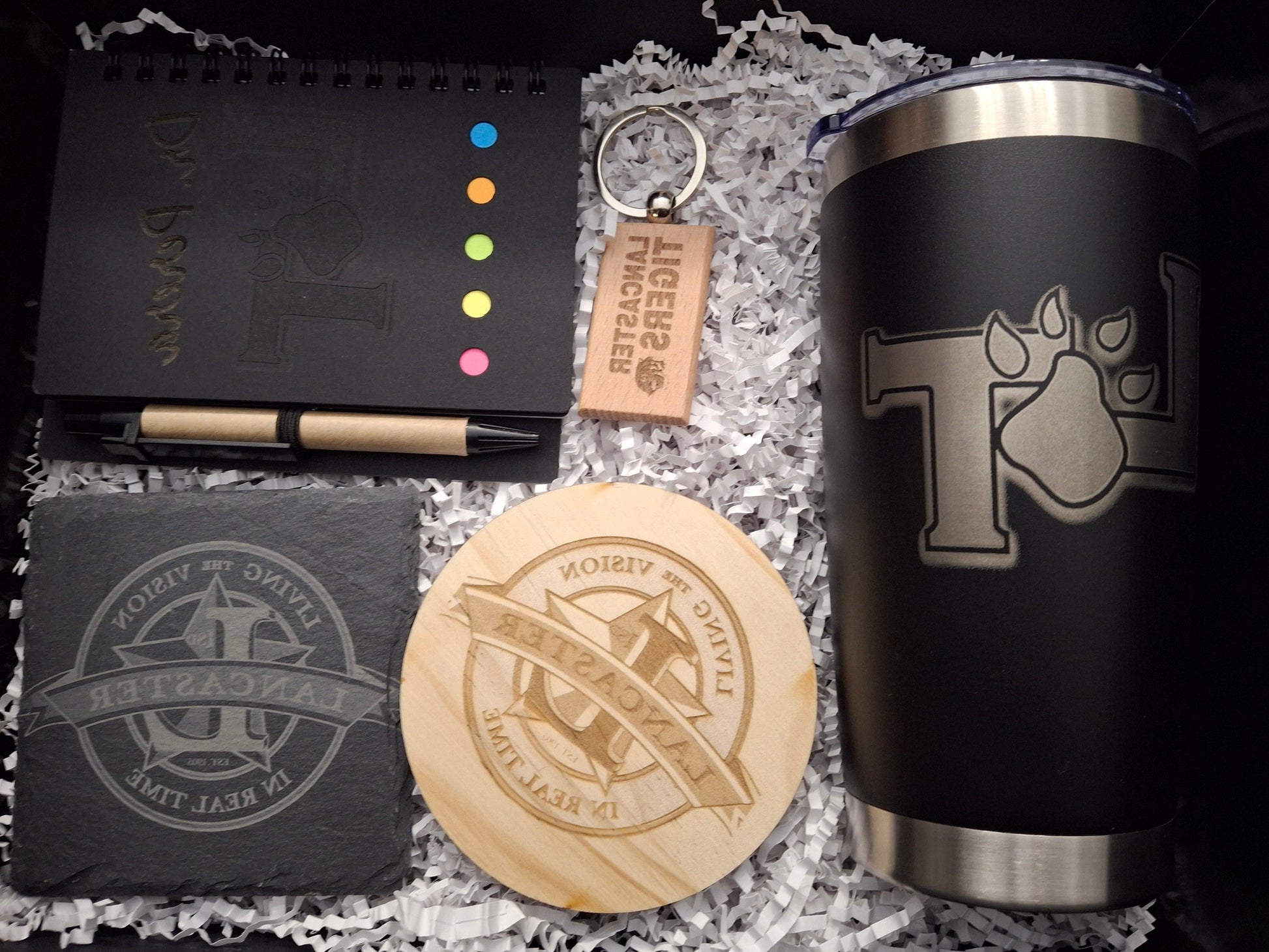Personalized Executive Gift Box- Custom Engraved Tumbler, Notebook w/Pen, Coaster & Keychain