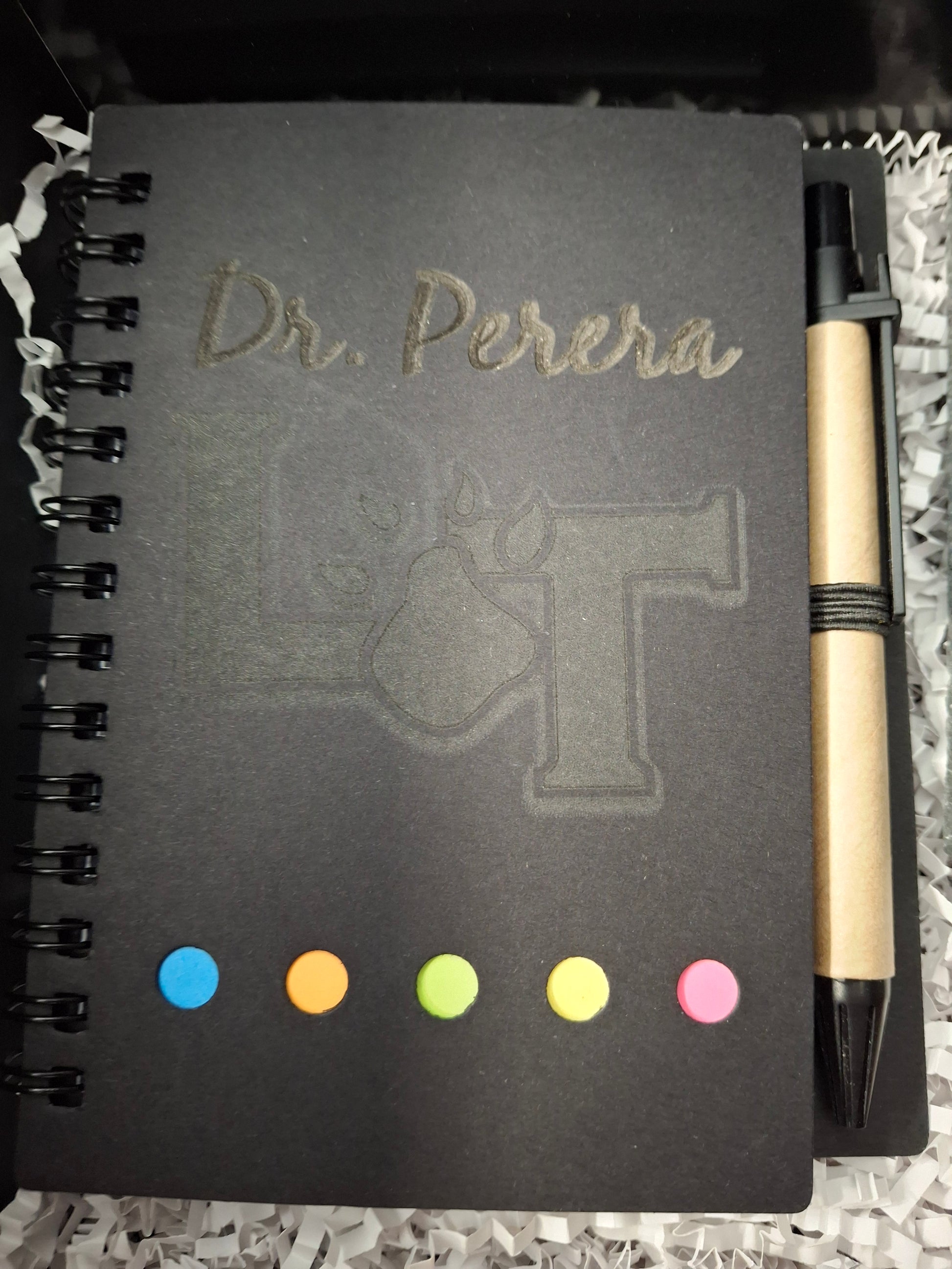 - (1) Custom Spiral Notebook + Pen- A stylish black notebook engraved with a name or phrase, complete with an attached pen for daily journaling or note-taking engraved with a name (optional)