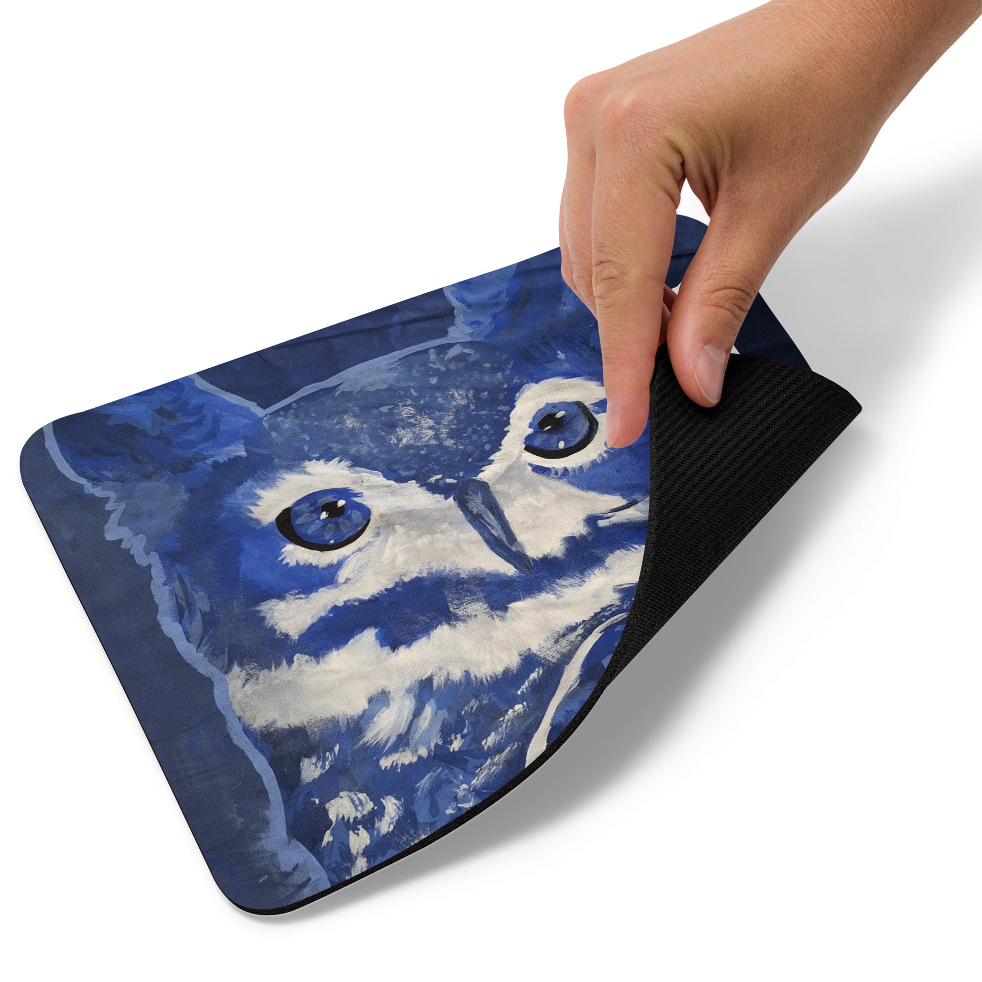 Bring wisdom, focus, and fierce creativity to your workspace with the Night Eyes premium mouse pad, featuring original artwork by Isabella Xochitl Hernandez. This bold depiction of a great horned owl—painted in rich, cool hues of blue and white—adds a striking visual element to any desk setup. It’s the perfect blend of functionality and fine art.