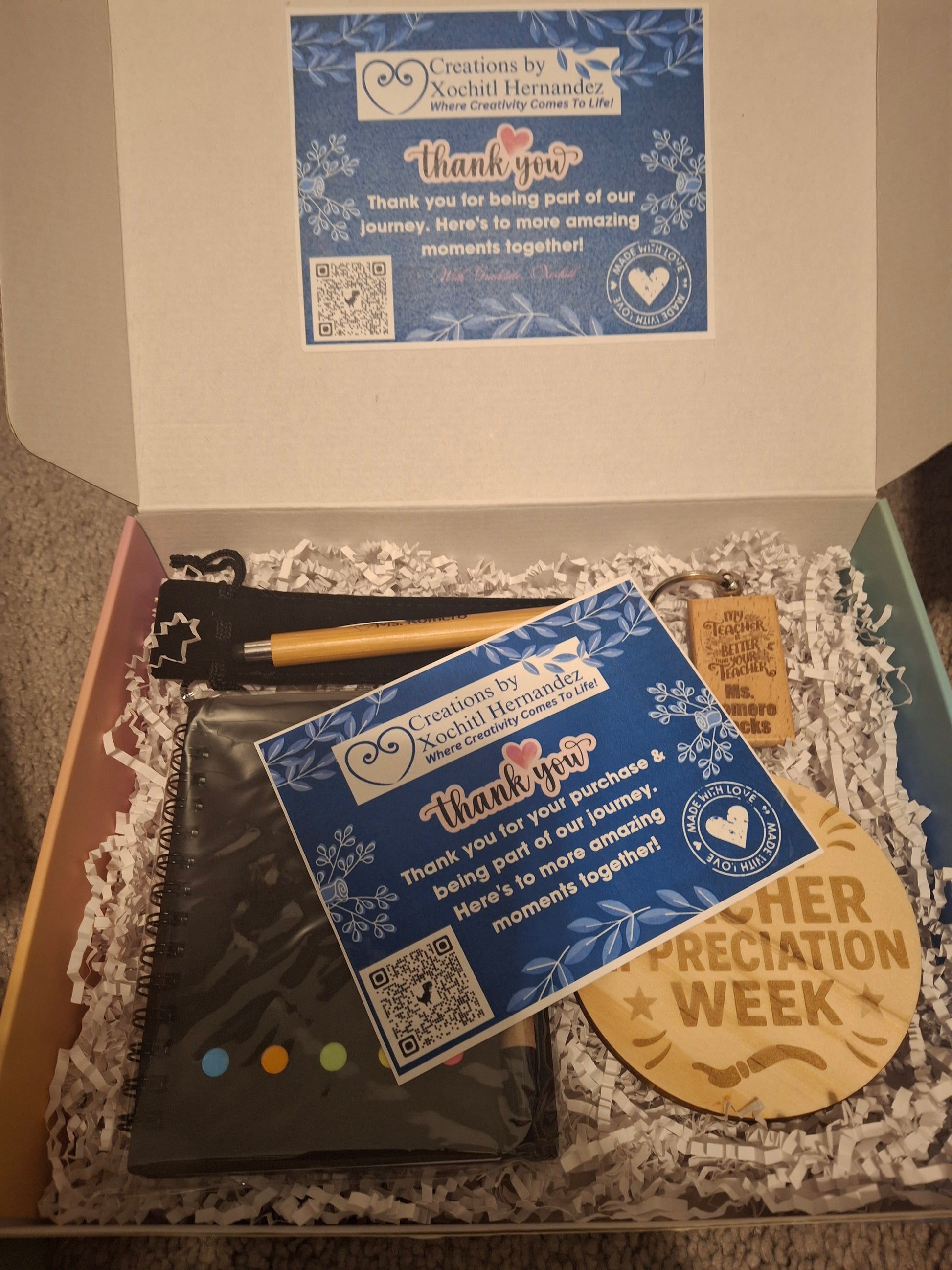 Where creativity meets personalization. Surprise someone special with this beautifully curated Appreciation Gift Box by Creations by Xochitl Hernandez. Thoughtfully designed and fully customizable, this elegant black set is perfect for birthdays, holidays, teacher appreciation, corporate events, or everyday appreciation.